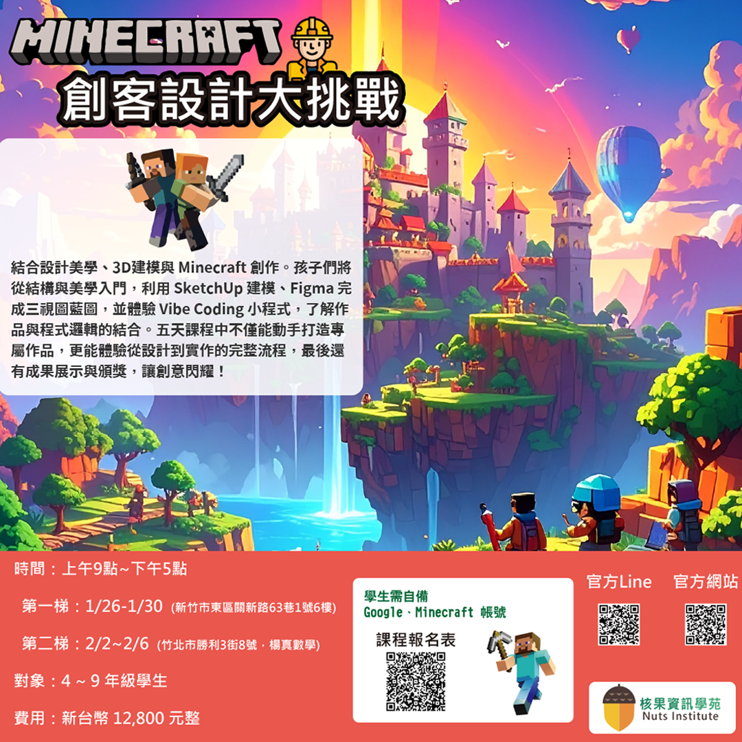 設計、建模、Vibe Coding,打造獨一無二的麥塊世界!對象:4 ~ 9 年級學生