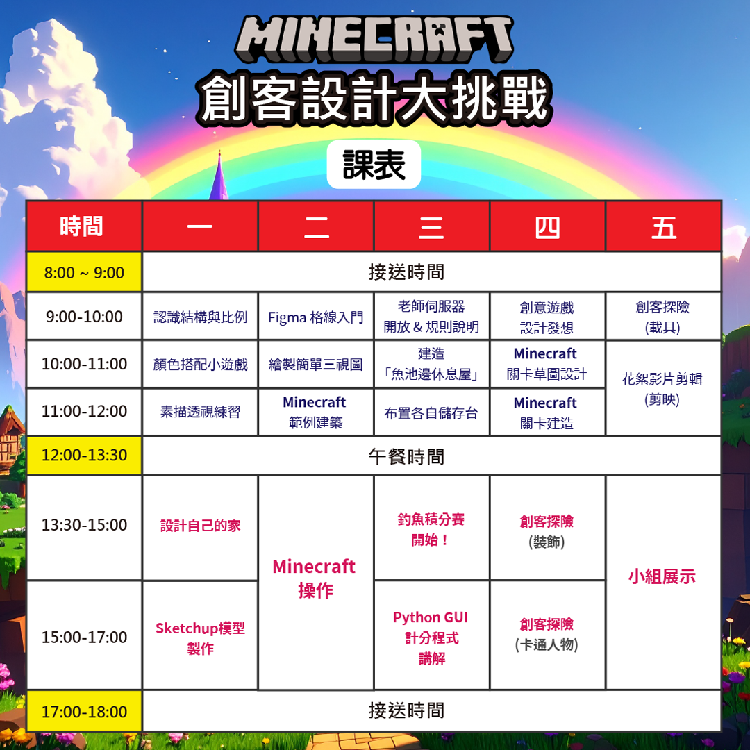費用:新台幣 12,800 元整學生請自備 Google 與 Minecraft (Java 版) 帳號。若無 Minecraft (Java 版) 帳號者,營隊期間可借主辦單位公用帳號使用,借用費每人 400 元。