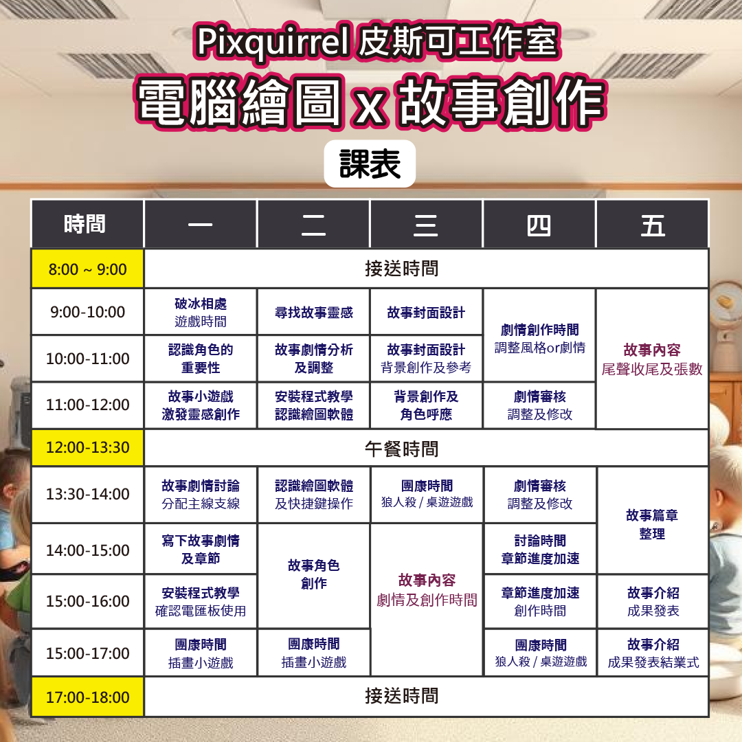 上午課程 (書桌小科技):上午 9 點到中午 12 點,早上 8 點即可送到教室