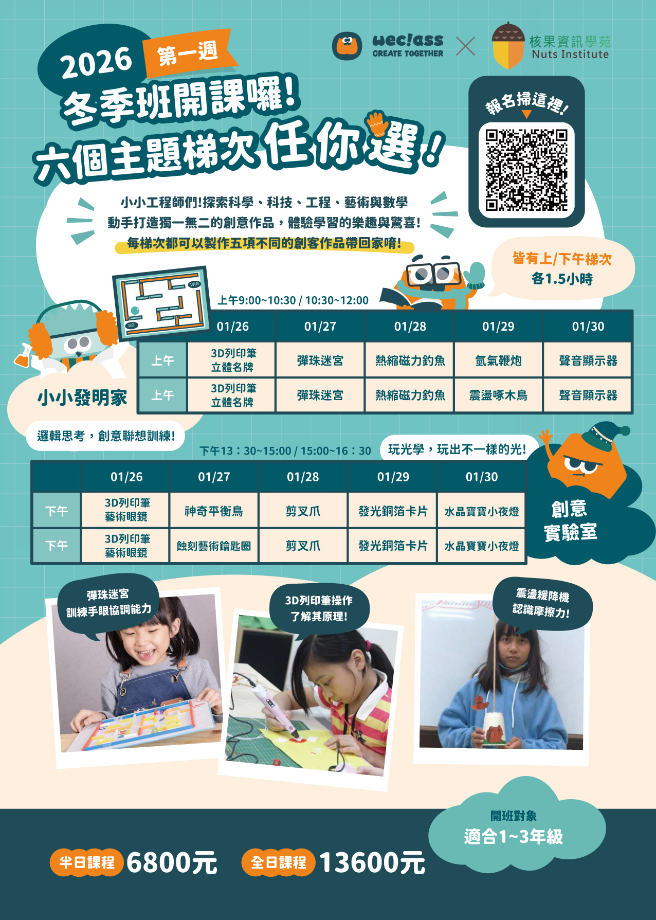 下午課程 (創意實驗室):下午 1 點半到下午 4 點半,可在教室待到晚上 6 點