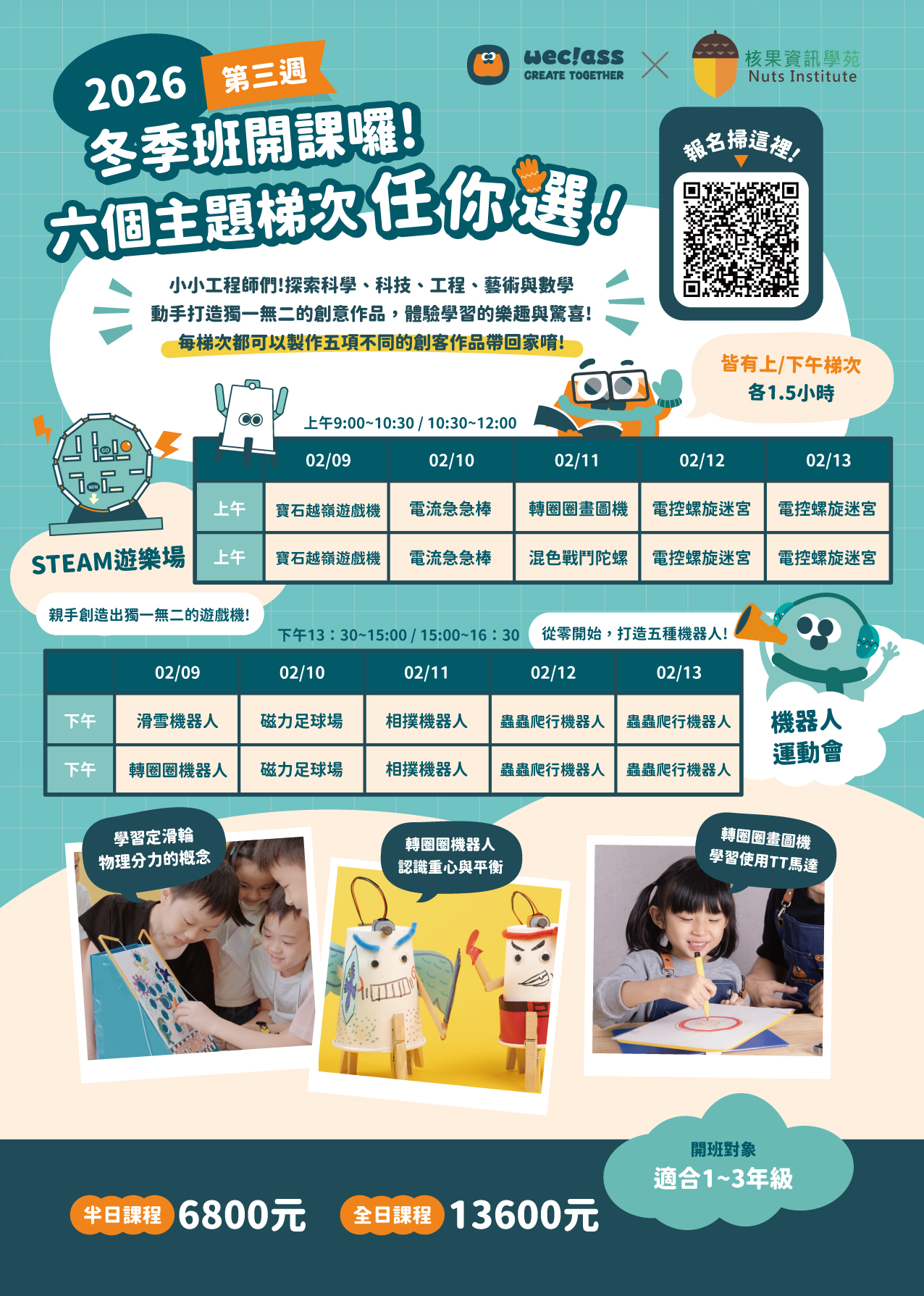 下午課程 (機器人運動會):下午 1 點半到下午 4 點半,可在教室待到晚上 6 點